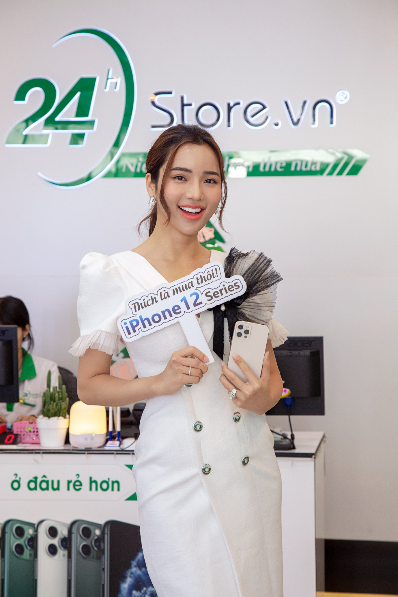 Bước vào cửa hàng, người mẫu Kim Cương bất ngờ khi được nhân viên trao ngay 2 chiếc iPhone 12 Pro Max được chuẩn bị sẵn. Chị chia sẻ rằng bản thân không hề được biết về món quà đặc biệt này. Sáng nay ông xã Ưng Hoàng Phúc dặn chị ăn mặc đẹp đi sự kiện lớn. Đến 24hStore bỗng nam ca sĩ rẽ vào, khiến Kim Cương lúng túng không hiểu chuyện gì cho đến khi thấy nhân viên mang 2 chiếc điện thoại ra và nói đó là quà của ông xã đặc biệt dành tặng chị.