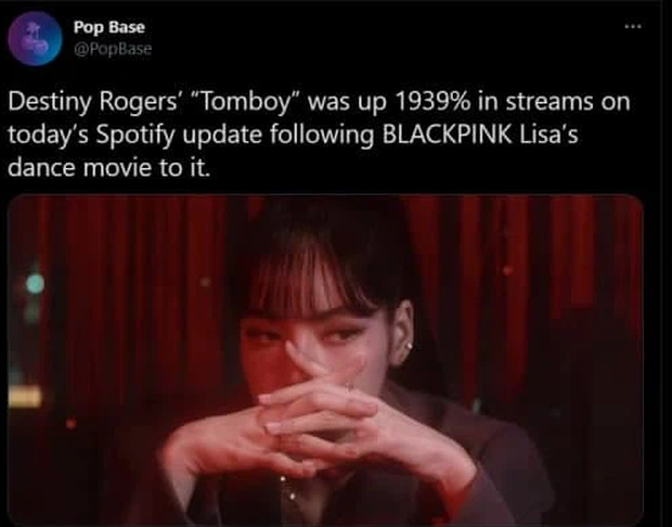 Và hiệu ứng của Lisa ra sao thì hãy nhìn vào những con số. Cụ thể, các diễn đàn Kpop đã đưa tin rằng bản audio của Tomboy trên Spotify đã có sự tăng trưởng lượt stream siêu khủng! Ca khúc đã tăng đến... 1939% lượt stream so với lượt stream trước đó sau khi The Movie của Lisa được đăng tải! Quả thực là một sự tăng trưởng rất gì và này nọ.