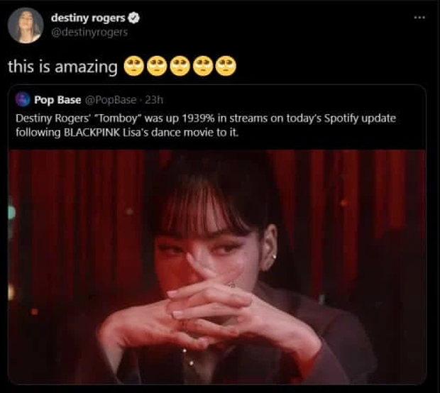 Destiny Rogers đã đăng tải dòng tweet đầy cảm kích trước thành tích vượt trội của ca khúc nhờ Lisa