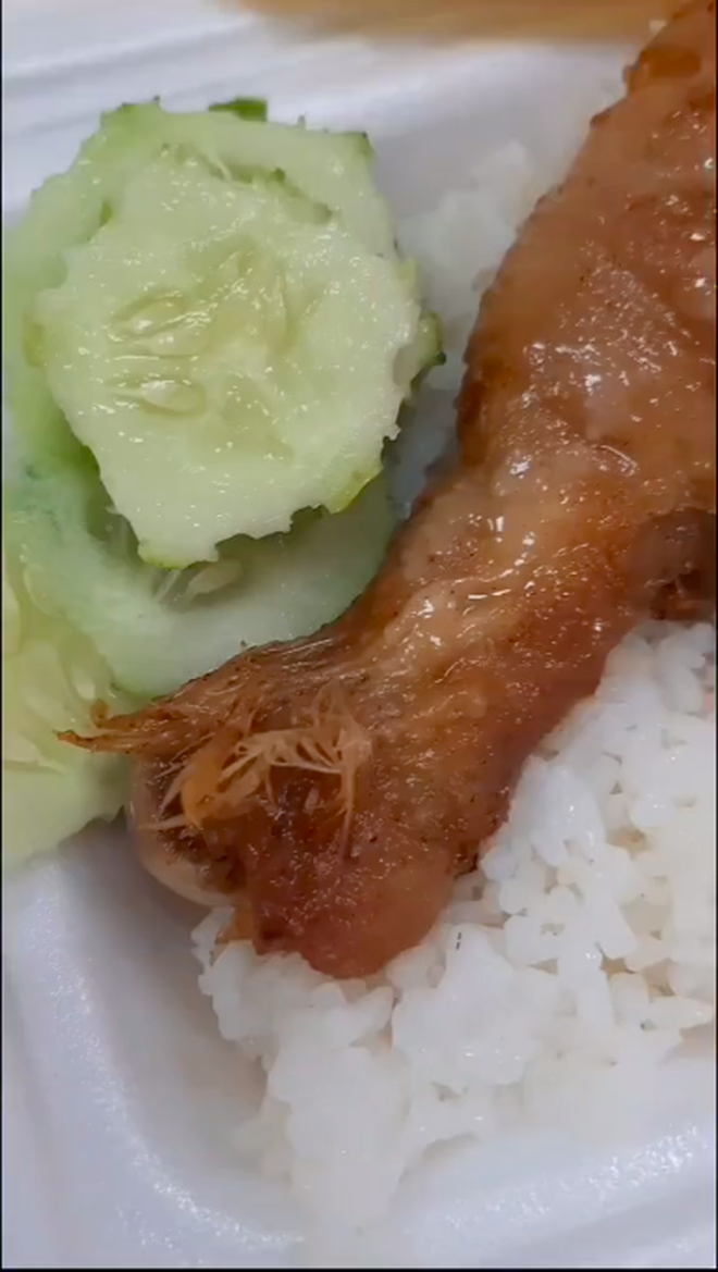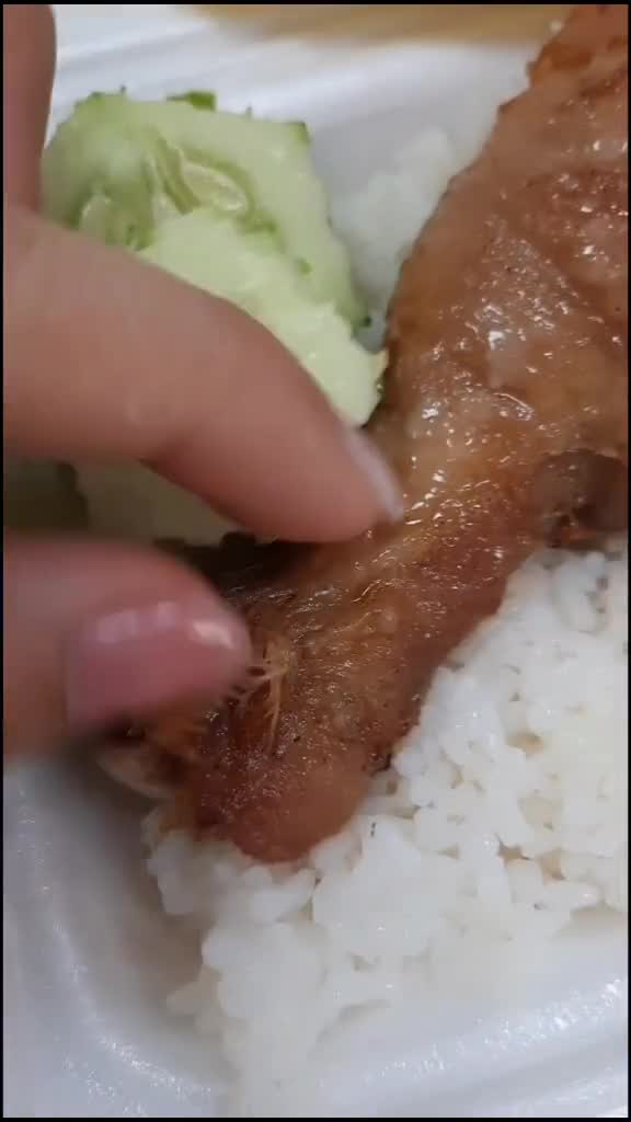 Mới đây, một cô gái đã đăng clip "bóc phốt" một quán cơm buôn bán kém vệ sinh lên TikTok. Theo đó, mua hộp cơm gà về nhà ăn, cô để ý kỹ lắm mới phát hiện ở phần cuối cái đùi gà nướng có vài sợi gì đó cứ tua tủa ra, nhìn nổi hết cả da gà.